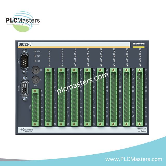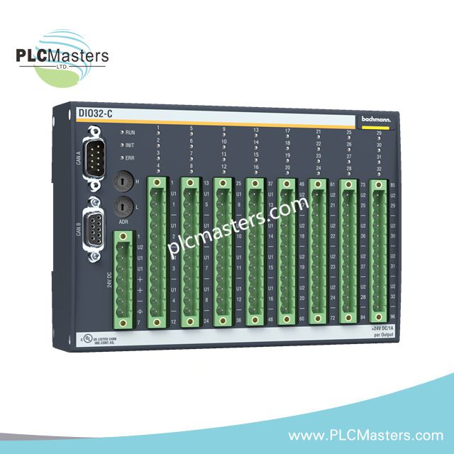 The Bachmann DIO32-C is a compact CAN Slave Digital-Ein-/Ausgangsmodule for decentralized automation. It provides 32 channels configurable as digital inputs or outputs for flexible control. This module integrates seamlessly via the CAN bus, supporting distributed industrial applications. Each channel features robust digital transistor outputs with galvanic isolation for reliable operation. LED indicators offer clear diagnostics for each channel, simplifying monitoring and troubleshooting. The module supports DIN rail or panel mounting, saving space in control cabinets.